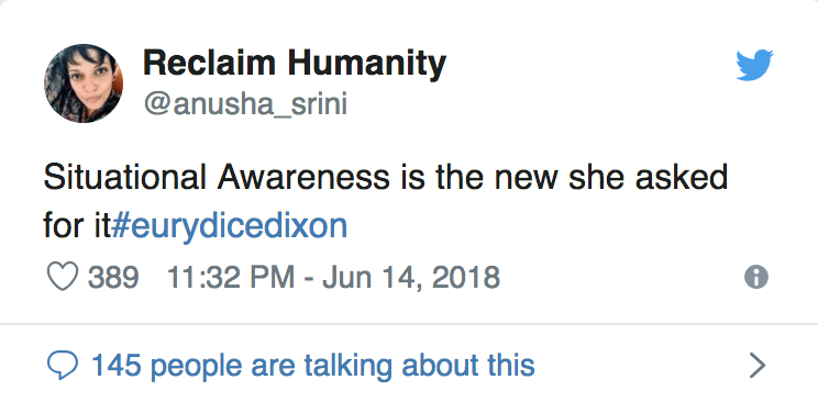 Srini, A 2018, Twitter update, 14 June, viewed 3 April 2019, https://twitter.com/anusha_srini/status/1007239249941311488?ref_src=twsrc%5Etfw%7Ctwcamp%5Etweetembed%7Ctwterm%5E1007239249941311488&ref_url=https%3A%2F%2Fwww.themarysue.com%2Fvictim-blaming-eurydice-dixon%2f
