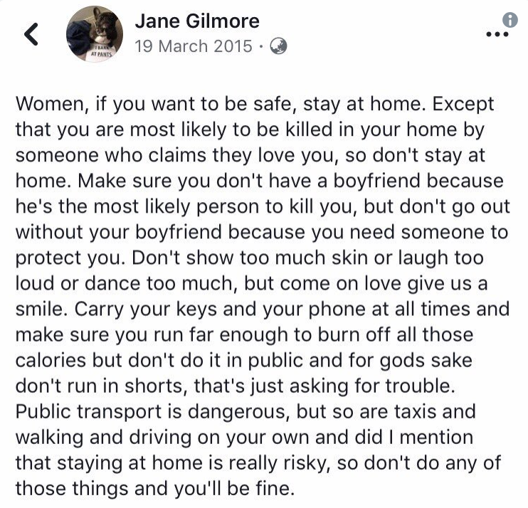 Gilmore, J 2015, Facebook update, 19 March, viewed 3 April 2019, https://www.facebook.com/pg/JaneGilmoreWriter/posts/