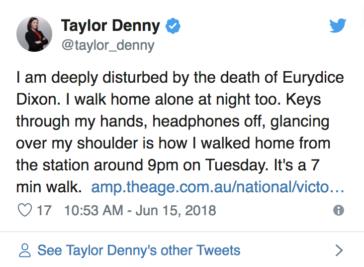 Denny, T 2018, Twitter update, 15 June, viewed 3 April 2019, https://twitter.com/taylor_denny/status/1007410706805809152?ref_src=twsrc%5Etfw%7Ctwcamp%5Etweetembed%7Ctwterm%5E1007410706805809152&ref_url=https%3A%2F%2Fwww.themarysue.com%2Fvictim-blaming-eurydice-dixon%2f