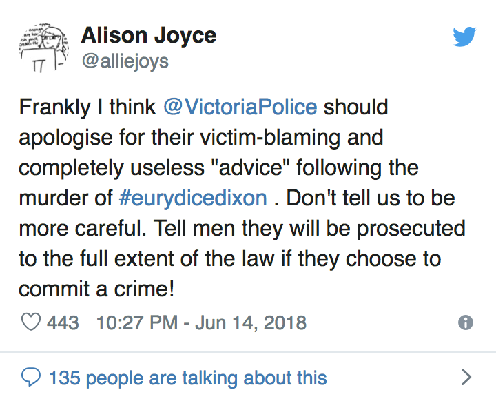 Joyce, A 2018, Twitter update, 14 June, viewed 3 April 2019, https://twitter.com/alliejoys/status/1007222915962531840?ref_src=twsrc%5Etfw%7Ctwcamp%5Etweetembed%7Ctwterm%5E1007222915962531840&ref_url=https%3A%2F%2Fwww.unilad.co.uk%2Fnews%2Fpeople-furious-over-police-warning-after-woman-was-murdered%2f