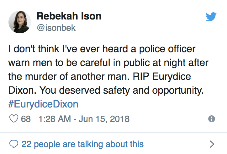Ison, R 2018, Twitter update, 14 June, viewed 3 April 2019, https://twitter.com/isonbek/status/1007268536950181889?ref_src=twsrc%5Etfw%7Ctwcamp%5Etweetembed%7Ctwterm%5E1007268536950181889&ref_url=https%3A%2F%2Fwww.themarysue.com%2Fvictim-blaming-eurydice-dixon%2F