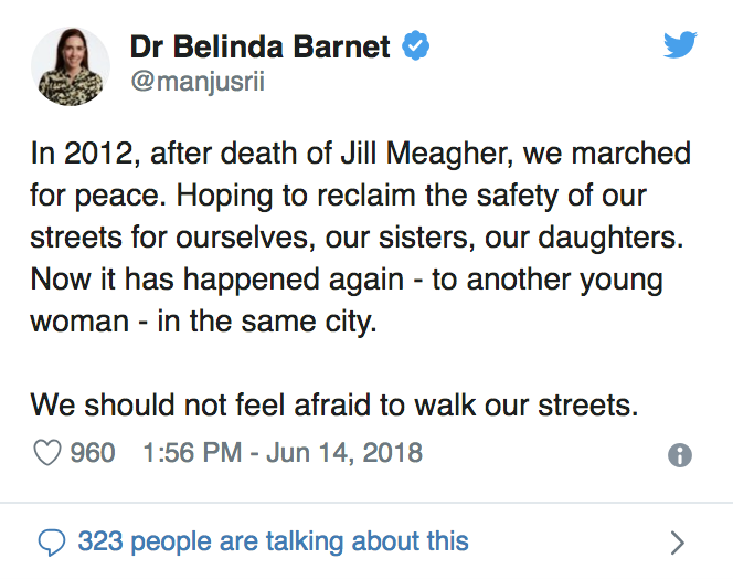 Barnet, B 2018, Twitter update, 13 June, viewed 3 April 2019, https://twitter.com/manjusrii/status/1007094376072339457?ref_src=twsrc%5Etfw%7Ctwcamp%5Etweetembed&ref_url=https%3A%2F%2Fwww.abc.net.au%2Fnews%2F2018-06-15%2Fwarning-on-personal-safety-after-eurydice-dixon-death-criticised%2F9873588